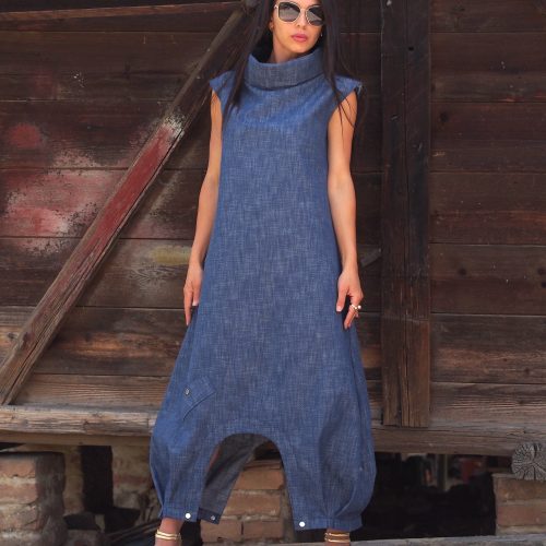 Sleeveless Long Denim Dress With Drop Crotch Cut